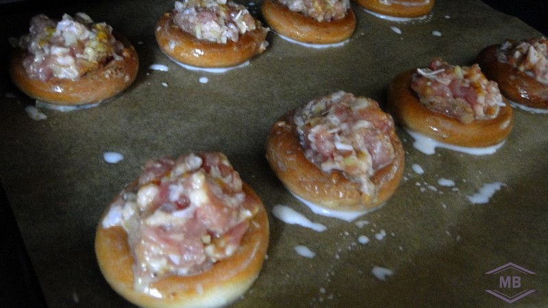 Внутрь баранков кладём фарш и выкладываем на противень с пекарской бумагой на небольшом расстоянии друг от друга.