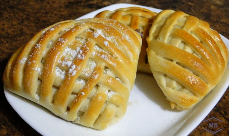 Раскатываем каждый кусочек теста на квадрат. Ножом делаем по 6-8 надрезов с двух сторон квадрата. На одну целую часть заготовки выкладываем немного начинки, а другой целой стороной закрываем нашу начинку. Выкладываем поочерёдно противоположные полоски теста, формируя плетение.