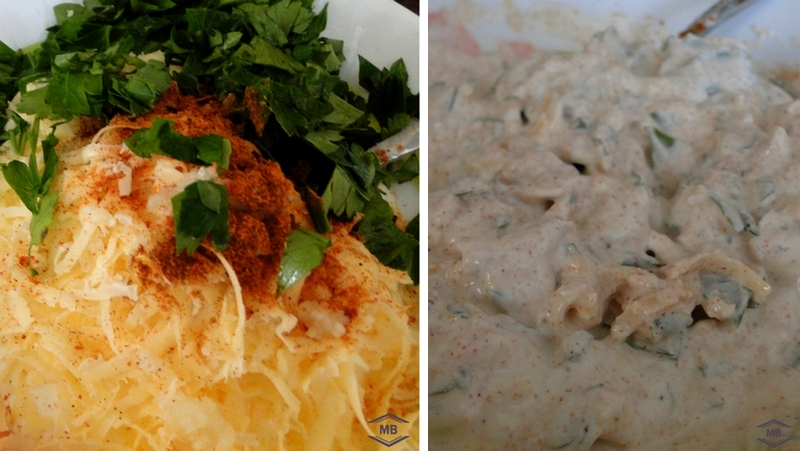 Делаем заправку. В миску выливаем сметану, добавляем натёртый сыр, пропущенный через пресс чеснок, мелко порубленную зелень и паприку. Перемешиваем.
