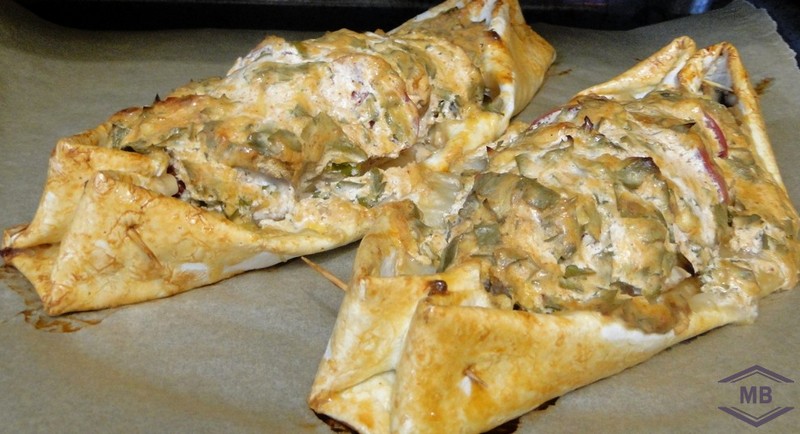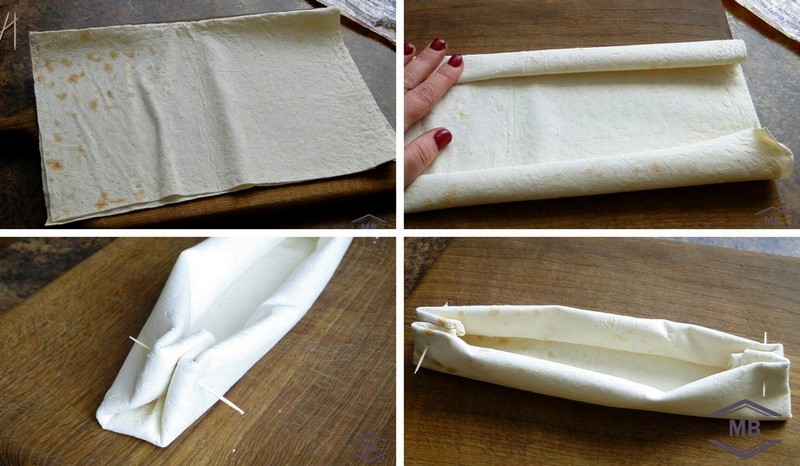 Теперь из лаваша делаем заготовку лодочек. Лист лаваша складываем пополам. Дважды подворачиваем широкие края листа лаваша. Затем противоположные края загибаем по одному разу. Каждый край соединяем друг с другом и закалываем зубочистками. «Лодочки» готовы.