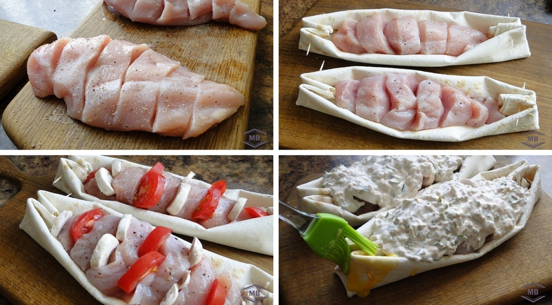 Ингредиенты (на две порции): 2 куриных филе, 2 листа лаваша, 4-6 шампиньонов, 2-3 томата, 1 яйцо, соль, специи — по вкусу. Для заправки: 100 грамм сметаны, 50 грамм сыра, 1/2 ч. ложка паприки копчёной, 1-2 зубчика чеснока, пучок зелени (петрушки и укропа).