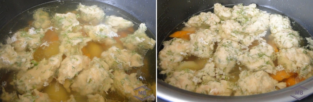 При помощи ложек сформируем галушки и отправляем в суп. Солим и добавляем специи, лаврушку. Готовим ещё 15-30 минут.