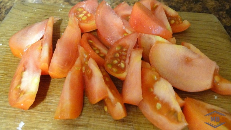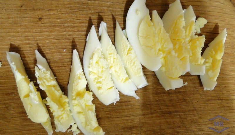 Отварные яйца очищаем и нарезаем дольками. Также дольками нарезаем помидоры. Свежие петрушку и лук пером мелко нарезаем.