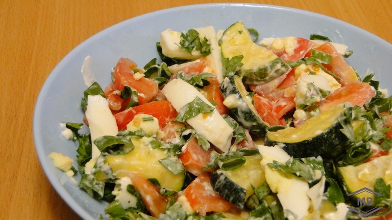 Ингредиенты: 1 (300 грамм) кабачок, 2 (150 грамм) помидора, 3 яйца, 1 зубчик чеснока, свежая зелень, соль, перец — по вкусу, растительное масло — для жарки, майонез или сметана — для заправки.