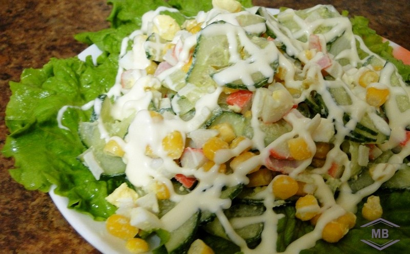 Ингредиенты: 200 грамм крабовых палочек, 3 яйца, 50 грамм плавленого сырка, 150 грамм кукурузы (консервированной), 1-2 (150 грамм) огурца, зелень – по вкусу, майонез – для заправки.