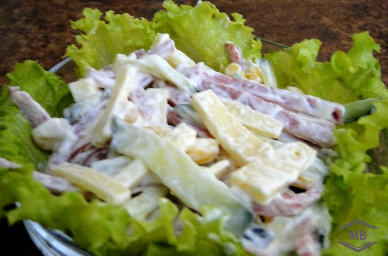 Ингредиенты: 150 грамм варено-копчёной колбаски, 150 грамм сыра, 150 грамм кукурузы (консервированной), 150 грамм огурцов, майонез – для заправки.