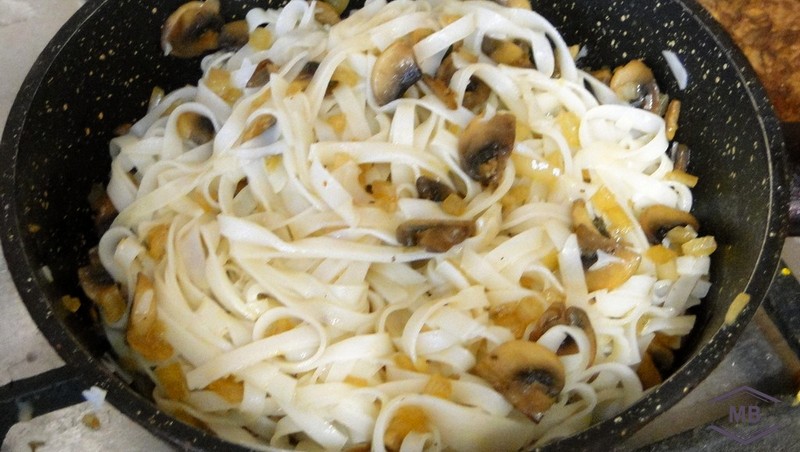 Теперь сливаем воду с рисовой лапши и перекладываем на сковородку с шампиньонами. Перемешиваем и обжариваем 5 минут.
