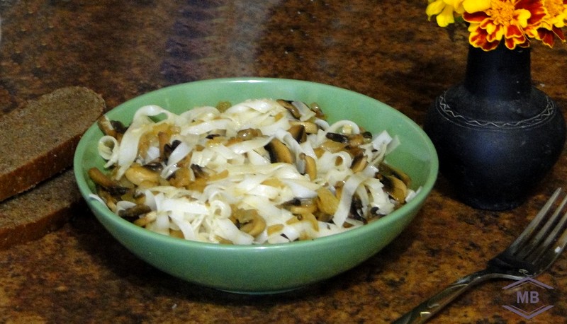 Ингредиенты: 200 грамм шампиньонов, 150 грамм фрунчозы, 1-2 головки лука, 1 столовая ложка соевого соуса, соль, перец и специи — по вкусу.