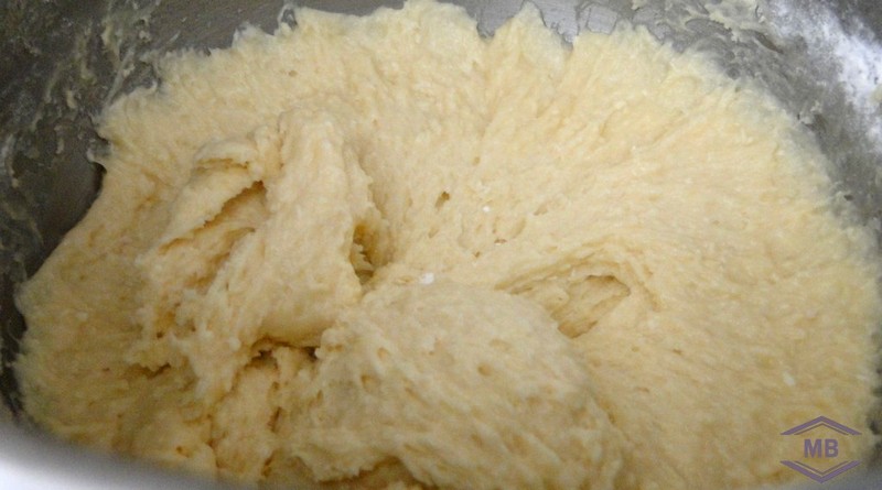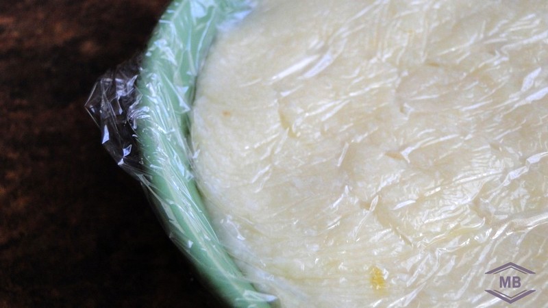 Начинку закрываем пищевой плёнкой в контакт и, пока она остывает, готовим тесто для рогаликов.