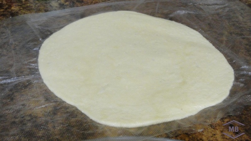 Чтобы тесто не прилипало к рукам, его раскатать можно накрыв с двух сторон плёнкой.