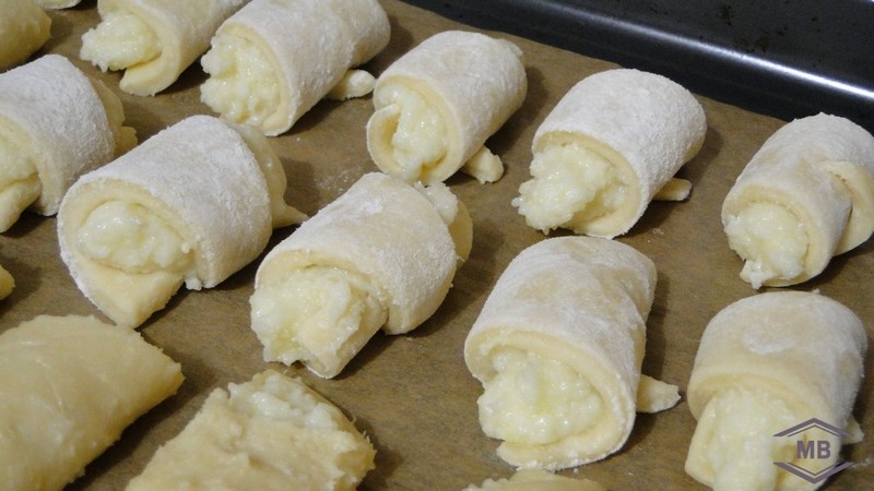 На широкий край треугольника из теста выкладываем немного начинки. Сворачиваем в рулет и перекладываем на противень с пекарской бумагой.
