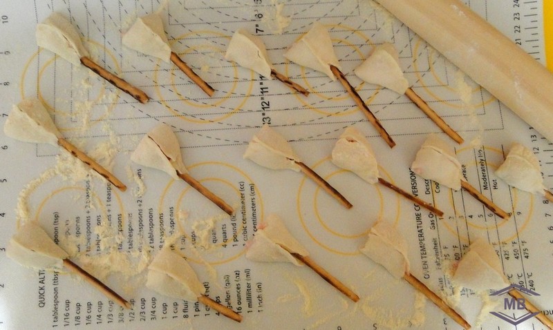 На эти кружочки выкладываем соломку, чтобы её края одинаково выходили за пределы теста. Затем в центр теста (на соломку) выкладываем немного фарша.