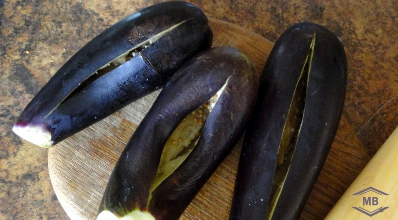 Скалкой разминаем баклажаны, чтобы нутро овоща стало мягким. Затем делаем продольный надрез.