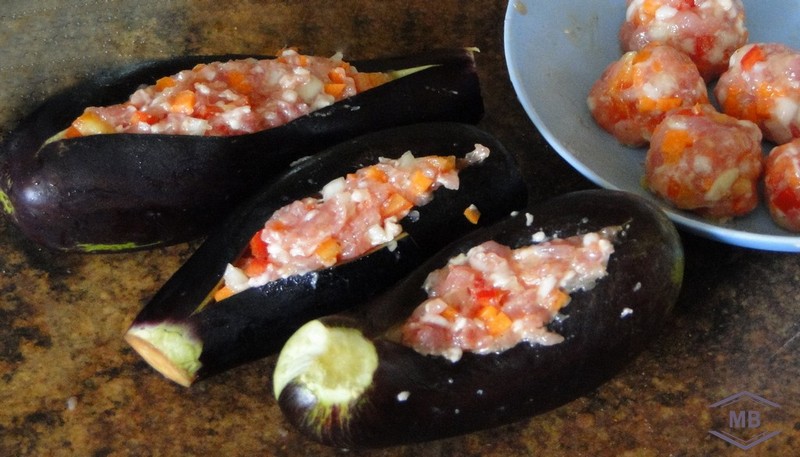 Ингредиенты: 3 баклажана, 250 грамм куриного фарша, 1 болгарский перец, 1 перец чили, 1 морковь, 2 головки лука, 4 столовых ложек томатной пасты, 500 мл воды, соль, перец, паприка, тмин — по вкусу.