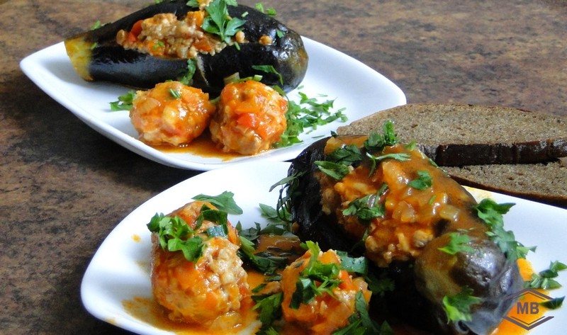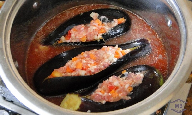 Выкладываем в кастрюлю фаршированные баклажаны и фрикадельки. Соус должен покрывать баклажаны. Если этого нет, доливаем воды. Тушим под крышкой 30 минут.