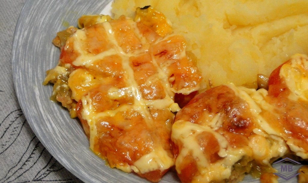 Закрываем шампиньоны томатами, нарезанным пластинами в 1 см.