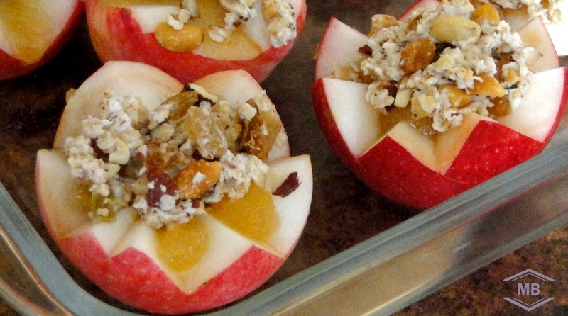 Ингредиенты: 3 яблока, 100-150 мл воды, 2 столовые ложки овсяных хлопьев «Геркулес», 6 чайных ложек мёда, 30-50 грамм сухофруктов и смеси орехов (изюм, курага, арахис, грецкие орехи, кешью, миндаль, фундук).
