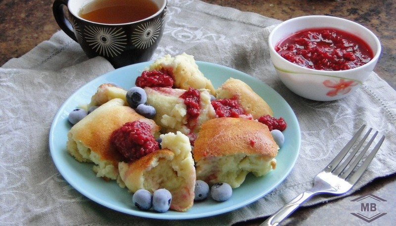 На готовом десерте делаем надрезы лопаткой уже с этой стороны и перекладываем кусочки омлета по тарелкам. Украшаем свежими или замороженными ягодами (предварительно разморозив).