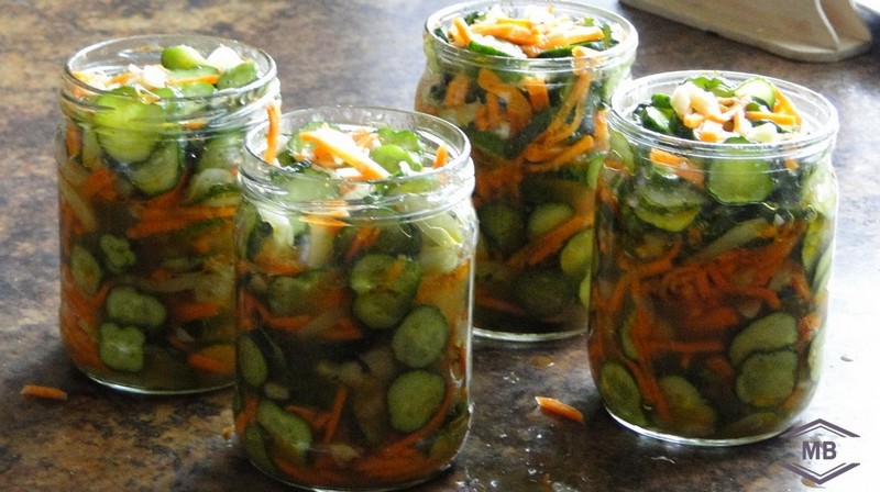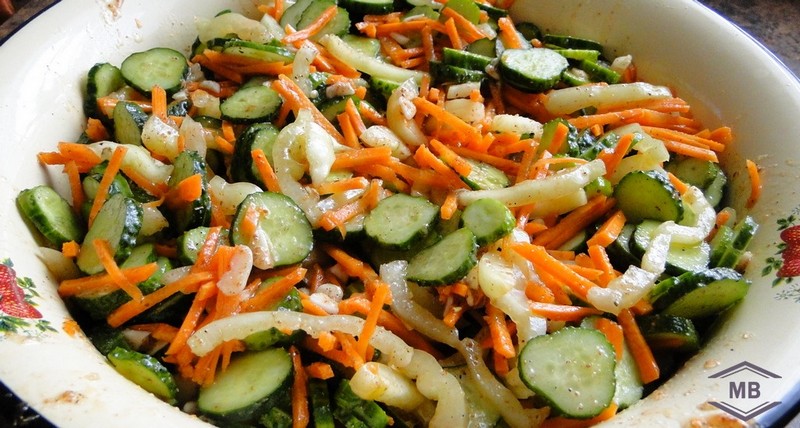 Ингредиенты (на 4 банки по 0,5 л): 1 кг огурцов, 400 грамм моркови, 300 грамм болгарского перца, 50 грамм чеснока. Заправка: 120 мл растительного масла, 65 грамм сахара, 30 мл уксуса, 20 грамм приправы для моркови по-корейски, 1 столовая ложка с небольшой горкой соли.