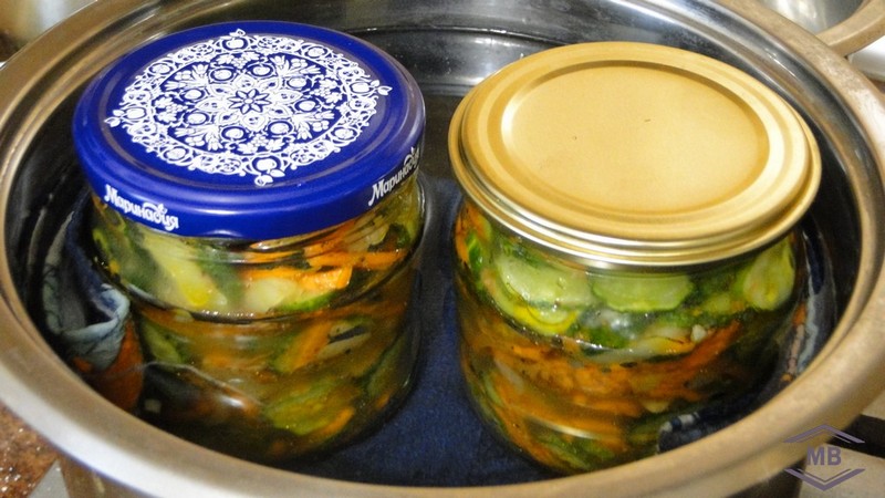 Отправляем банки с салатом в кастрюли, где дно застелено небольшим полотенцем. Наливаем тёплой воды по плечики банок.