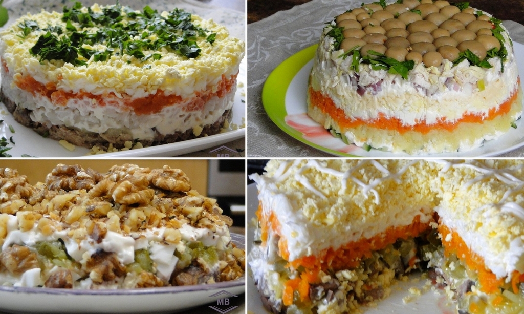 Вот четыре рецепта сочных, вкусных, красивых слоёных салатов из грибов, рыбы, печени и говядины!