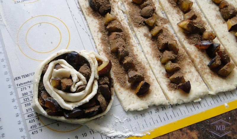 Подняв бока полоски теста так, чтобы сливовая начинка оказалась внутри, сворачиваем тесто улиткой. Также сложив следующую полоску теста с начинкой, продолжаем скручивать пирог улиткой. Так поступаем с оставшимися полосками теста с начинкой.
