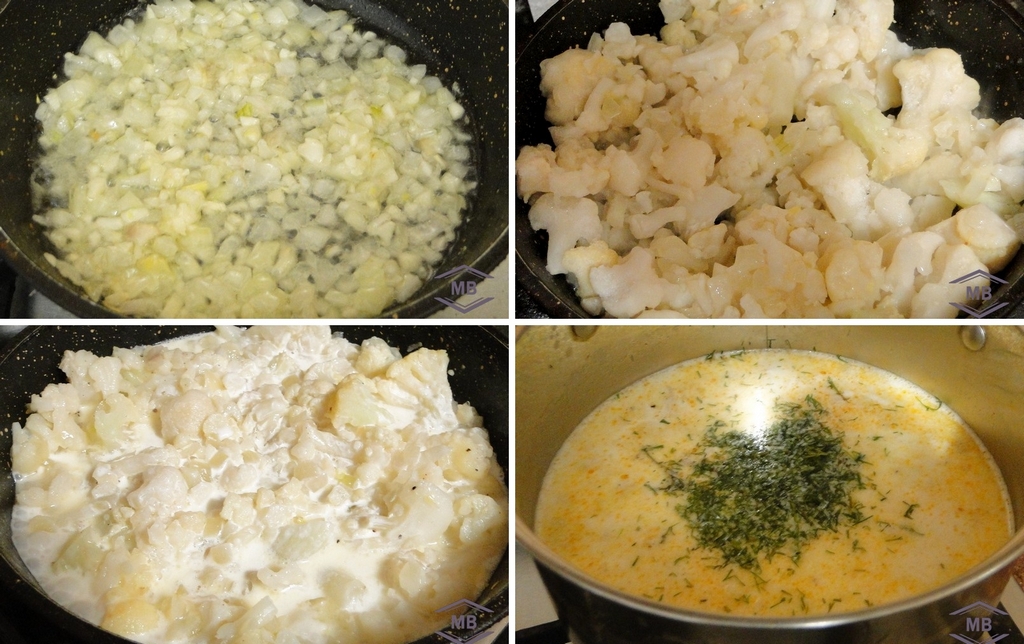 Ингредиенты: 1 л воды, 500 мл бульона, 500 мл молока, 250 грамм куриного филе, 300-500 грамм цветной капусты, 1-2 головки лука, 100 мл 20% сливок, 50 грамм сливочного масла, 50 мл растительного масла, 2 зубчика чеснока, пучок свежей зелени, соль и перец — по вкусу.
