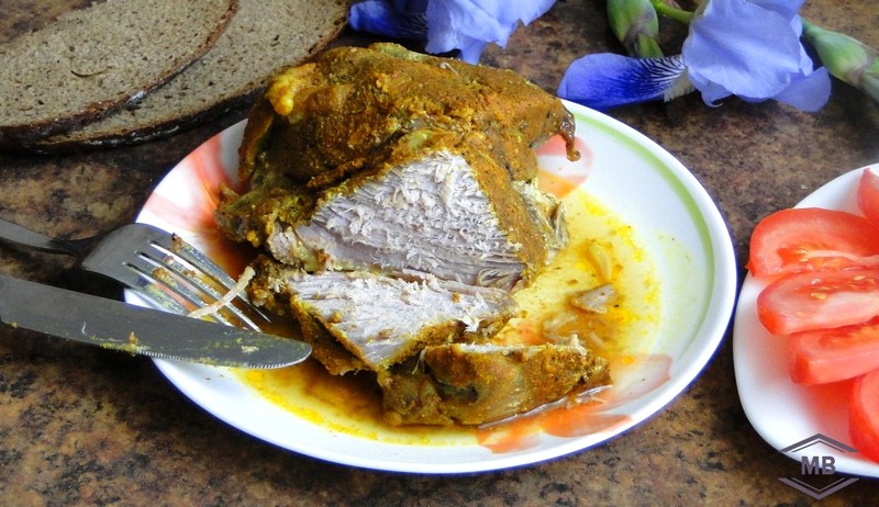 Ингредиенты: 700 грамм — 1 кг свинины, по 1 чайной ложке паприки, кориандра молотого, куркуму, хмели-сунели, пол чайной ложки перца чёрного молотого, 1 чайная ложка горчицы в семенах — по желанию, 1 чайная ложка молотого чеснока или 5-6 зубчиков чеснока свежего, 1 столовая ложка соли.