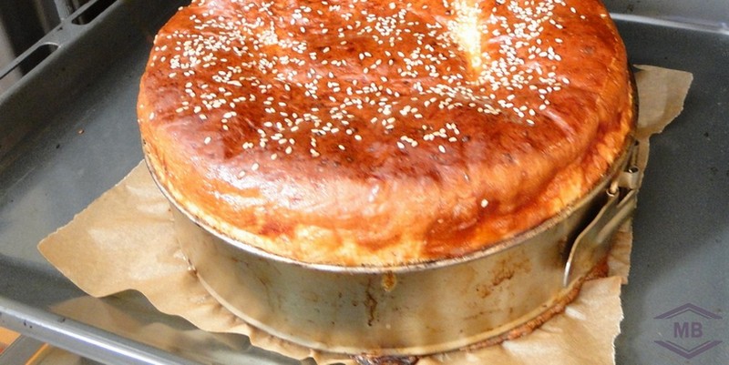 Яйцо вилкой взбиваем до однородности и промазываем верх пирога, посыпаем кунжутом.