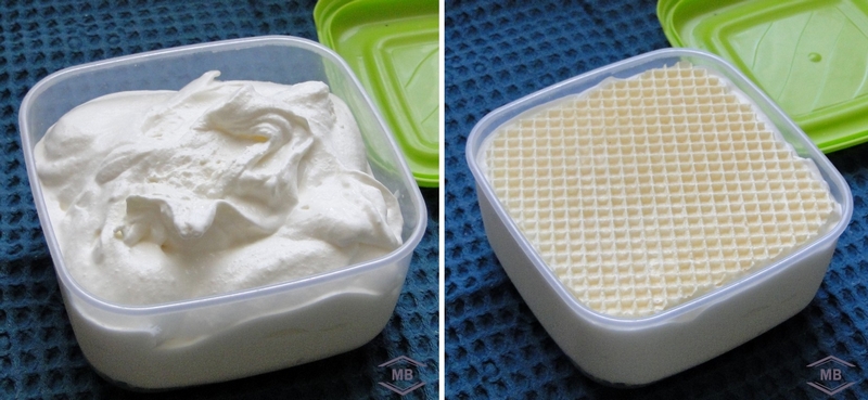 Готовую массу для мороженого переливаем в контейнер, на дне которого лежит вафельный корж. Закрываем мороженое вторым вафельным листом. Отправляем в морозильник застывать сливочное мороженое на 3-5 часов.