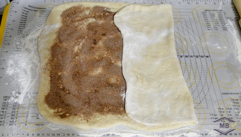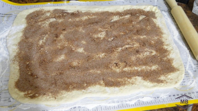 Смазываем пласт теста сливочным маслом комнатной температуры. Посыпаем сначала равномерно по периметру теста сахаром. А после — корицей, через сито, чтобы не образовывалось комочков. Можно сразу в пиале соединить сахар с корицей и, перемешав, равномерно распределить по пласту теста. Можно корицу заменить на какао-порошок, получаются также очень вкусные кексики.