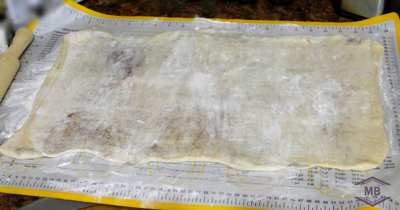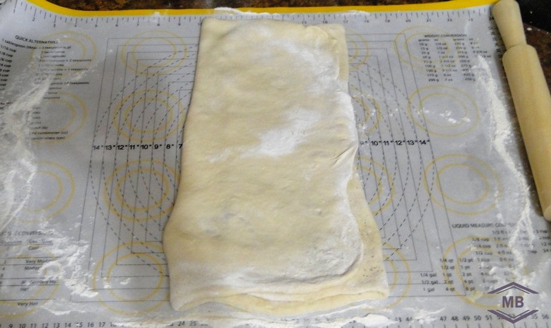 Складываем пласт теста таким образом: зрительно тесто делим на три равные части. Первым краем теста закрываем центральную часть. Затем вторым краем теста закрываем предыдущий пласт теста.