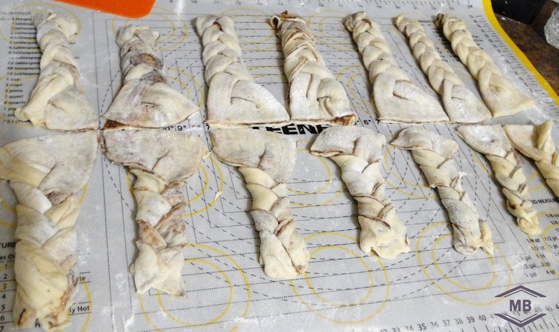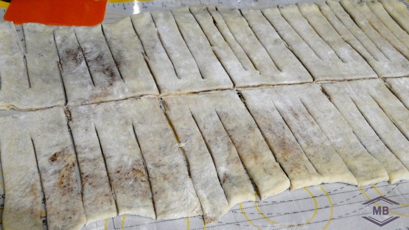 Тесто нарезаем на прямоугольники, сделав в них ещё по три надреза. Из этих «нитей» будем плести косички для будущих кексиков.