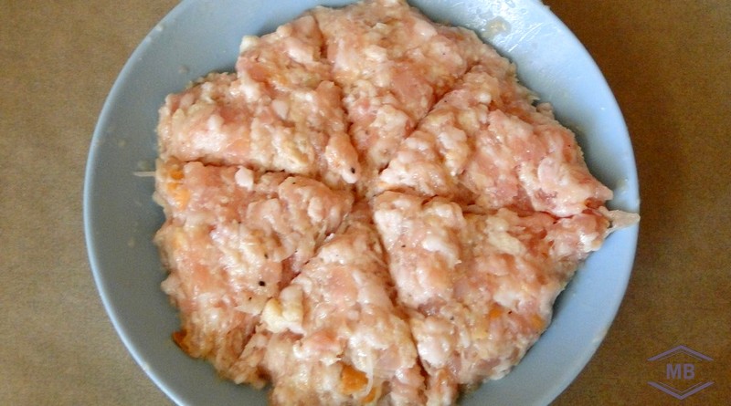 Ножом проводим разрезы по фаршу, чтобы сделать 6 лодочек одного размера. Руки смачиваем в воде. Берём 1/6 часть фарша и формируем из котлету.