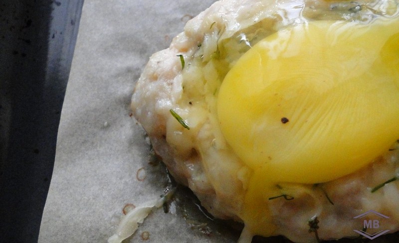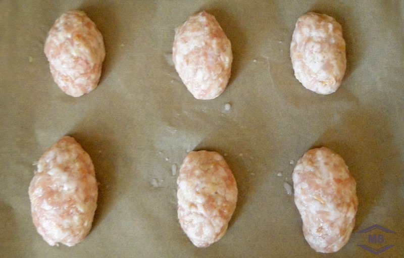 Противень застилаем пергамином и выкладываем на него наши 6 котлет на небольшом расстоянии друг от друга.