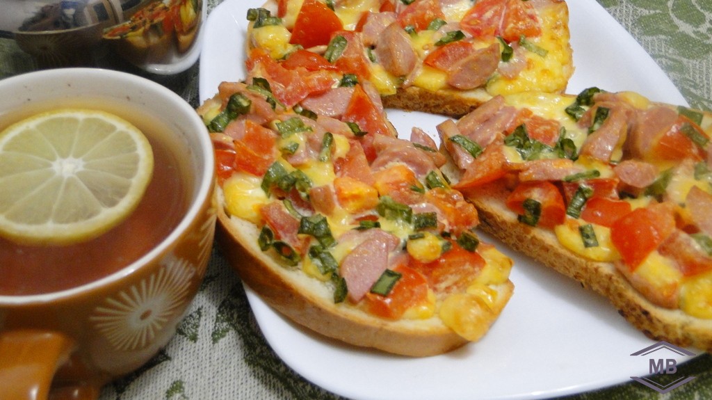 Ингредиенты: 3-4 ломтика батона, 3-4 сосиски, 1 томат, 50 грамм твёрдого сыра, 1 шт лука пером, 1 столовая ложка майонеза.