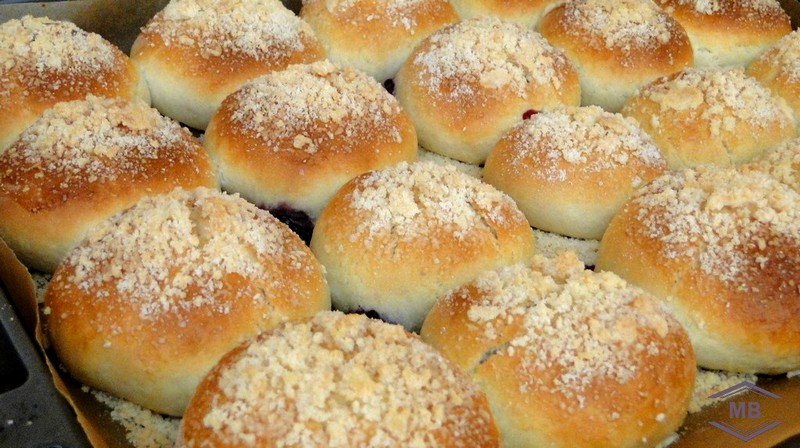Ингредиенты: 600-630 грамм муки, 300 мл молока, 120 грамм сахара, 70 гр сливочного масла, 7 грамм сухих дрожжей или 20 грамм свежих дрожжей, 2 яйца + 1 яйцо для смазывания, 1/4 чайной ложки соды, щепотка соли, ваниль — по вкусу. Штрейзель: 45 грамм муки, 40 грамм сахара, 20 грамм сливочного масла.