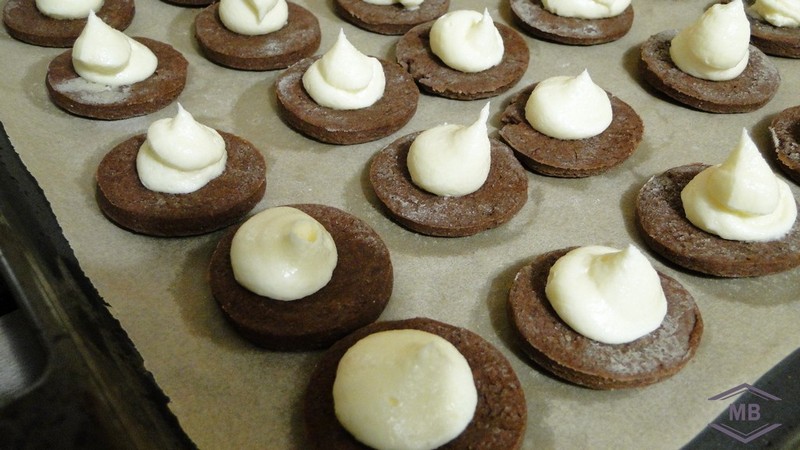 Остывшие заготовки печенья переворачиваем лицевой стороной вниз. Выдавливаем немного крема на все заготовки.