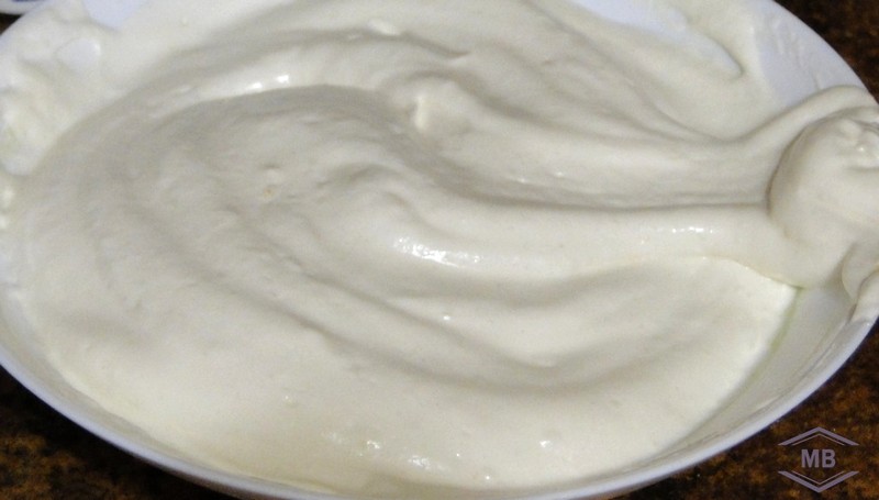 В яичные белки вливаем лимонный сок. Взбиваем миксером до получения устойчивой пены на небольших оборотах (около 3 минут). Затем вводим сахар и продолжаем взбивать белки до жёстких пиков (около 4 минут).