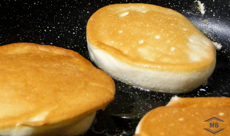 Выпекаем оладьи на разогретой сковороде с растительным маслом на небольшом огне. Вливаем к панкейкам 1-2 чайные ложки воды, чтобы получить пар в процессе приготовления. Выпекаем оладьи под крышкой  около 5 минут, пока поверхность теста не станет матовой, а низ не подрумянится. Затем аккуратно переворачиваем оладьи на другую сторону и повторяем процесс.